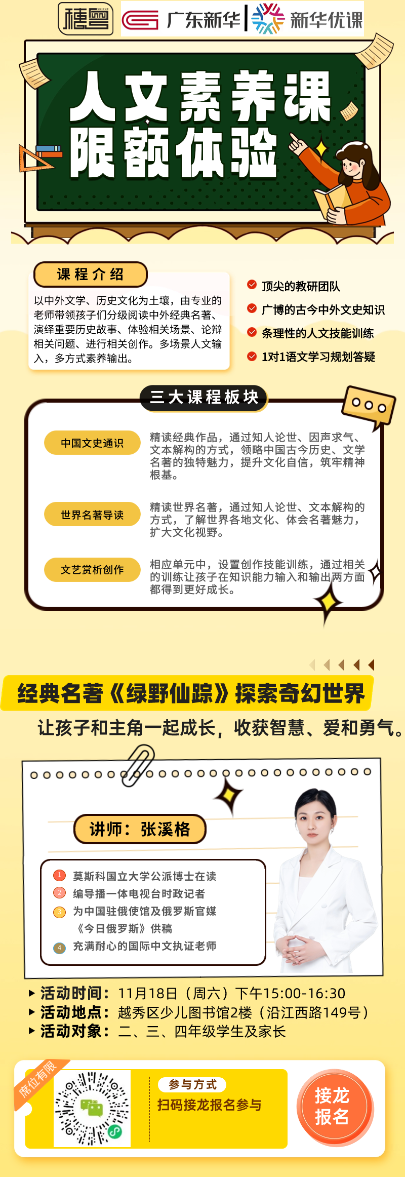 以中外文学、历史文化为土壤,由专业的老师带领孩子们分级阅读中外经典名著、演绎重要历史故事、体验相关场景、论辩相关问题并进行相关创作。本活动由顶尖的教研团队开展,将进行多场景人文输入以及多方式素养输出。