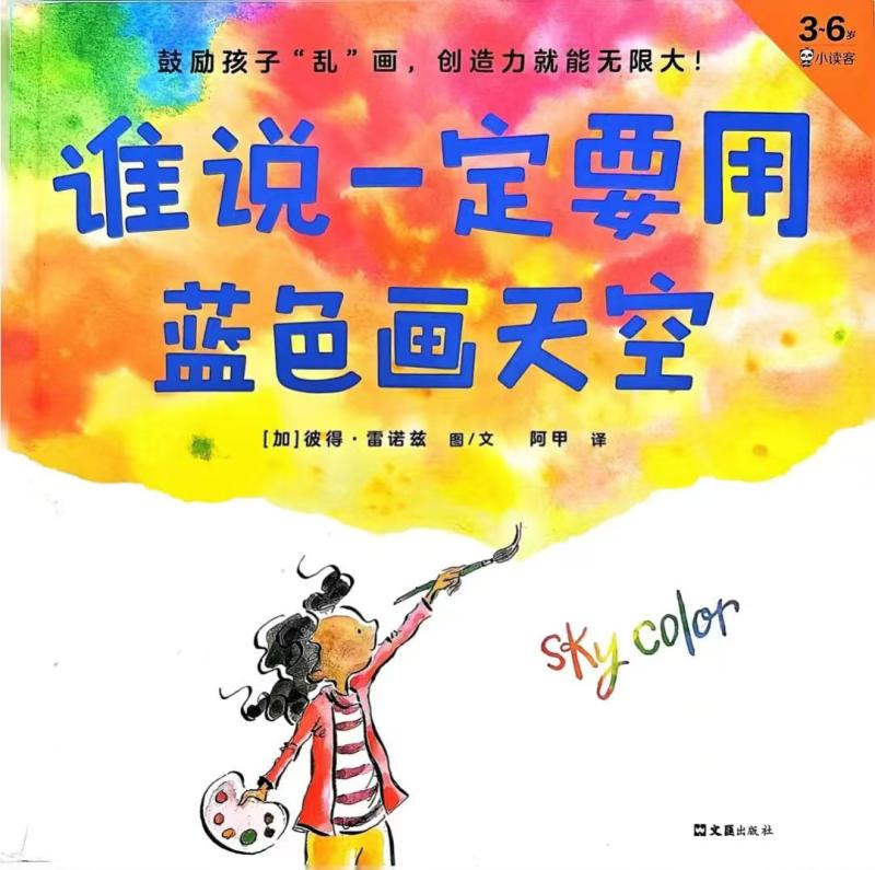与读者分享绘本《谁说一定要用蓝色画天空》。玛莉想画天空,可翻遍了颜料盒,就是找不到蓝色。“没有蓝色,怎么画天空呢?”玛莉很困惑。放学后,她看到傍晚的天空是渐变的黄色;回到家,她看着天空慢慢变成了黑色;睡梦里,她飘浮在色彩绚烂的天空中;原来天空不只是蓝色,玛莉开心地画出了自己心中天空的颜色。这是一本可以培养孩子创造力的绘本,尊重孩子的想法,引导孩子们认识丰富的色彩,扩宽孩子的认知,不要局限于对物品的固有色彩判断,引导孩子们进入充满创意和想象力的世界。
